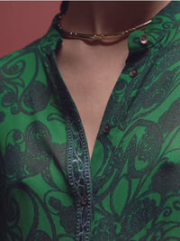 A bold take on classic paisley in sheer viscose chiffon. Green and blue tones float softly over the body. Feminine and flowy with just enough edge.