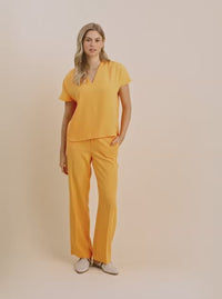 There's nothing better than pants that exude chicness while offering a comfortable fit. This pair has a trendy box fit with a mid/high-rise, featuring an elastic waistband and side pockets, all in a soft fabric. Pressed creases lend an additional layer of elegance. Pair them with the matching blouse to achieve a seamless and stylish ensemble.
