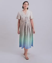 Embrace effortless elegance with this feminine dress, styled in a relaxed fit with short sleeves, a flattering V-neck, and delicate shoulder pleats. Featuring a vibrant gradient jacquard print that blends multiple colours, it offers versatility with adjustable waist ties for a cinched or loose silhouette. Pair with heeled sandals for a perfect spring party outfit.